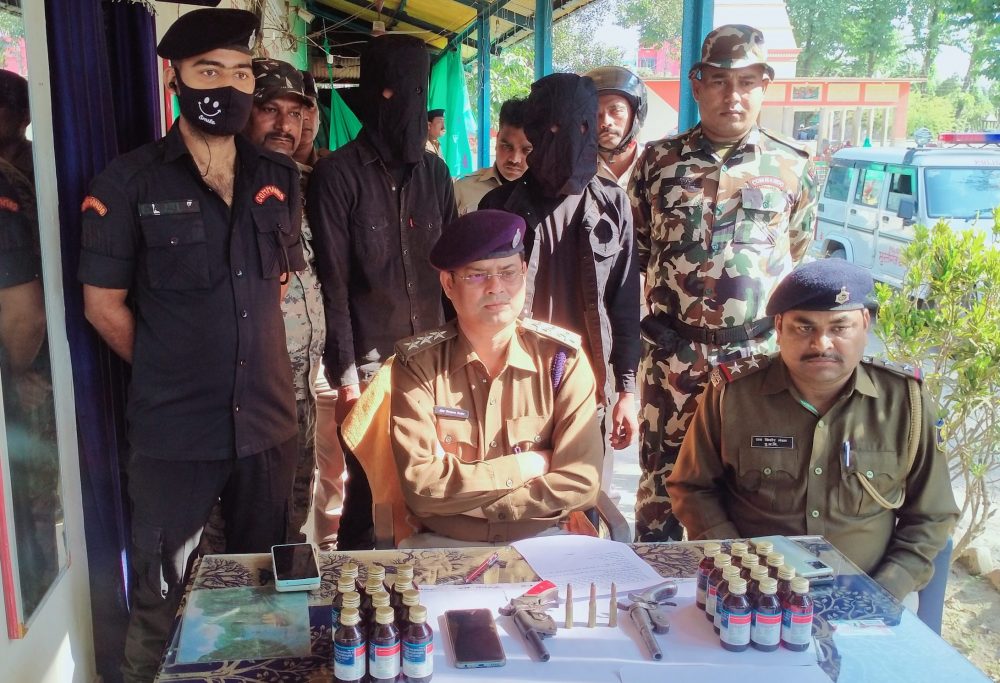 मुरलीगंज थाना क्षेत्र अंतर्गत मध्य विद्यालय जोरगामा के समीप पुलिस ने रविवार के शाम में संध्या गश्ती के दौरान पल्सर बाइक पर सवार दो युवक को देशी कट्टा व 24 बोतल कोडीन युक्त सिरप के साथ गिरफ्तार किया है। गिरफ्तार दोनो युवक शंकरपुर थाना क्षेत्र के बसंतपुर गांव निवासी दिलखुश कुमार व रायभीड़ गांव निवासी आनन्द कुमार को मादक पदार्थ अधिनियम के तहत प्राथमिकी दर्ज कर न्यायिक हिरासत में भेज दिया गया। सोमवार को थाना पर सदर एसडीपीओ अजय नारायण यादव ने प्रेस वार्ता कर उक्त मामले की जानकारी दी। बताया कि अपराध नियंत्रण एवं अपराधियों की गिरफ्तारी के लिए मुरलीगंज थाना पुलिस द्वारा लगातार वाहन जांच की जाती है। इसी क्रम में रविवार की संध्या में मुरलीगंज थाना अंतर्गत जोरगामा मध्य विद्यालय के समीप एसआई पीसी पासवान तथा पुलिस बल कुंदन कुमार, मुकेश कुमार तथा लालबहादुर पासवान के द्वारा वाहन जांच के दौरान दो अपराध कर्मियों को गिरफ्तार किया गया है गिरफ्तार अपराधकर्मी के पास से एक देशी कट्टा एवं दो ज़िंदा कारतूस, 24 बोतल कोडीन युक्त कफ सीरप, एक मोबाइल तथा एक मोटरसायकिल बरामद किया गया है। जिसमें दोनों अपराधकर्मी मधेपुरा जिला के शंकरपुर थाना के रहने वाले हैं। इनका आपराधिक इतिहास खंगाला जा रहा है।